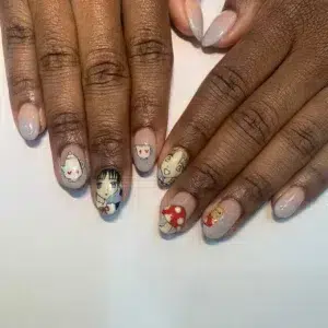 Toto třpytivé nahé ombré by se zdálo jednoduché, až na ručně kreslené tváře od Chana. Obě postavy jsou nejlepší kamarádky ze série Gakuen Alice . Čajová konvice a šálek plus houby jsou nejroztomilejší detaily na této manikúře.