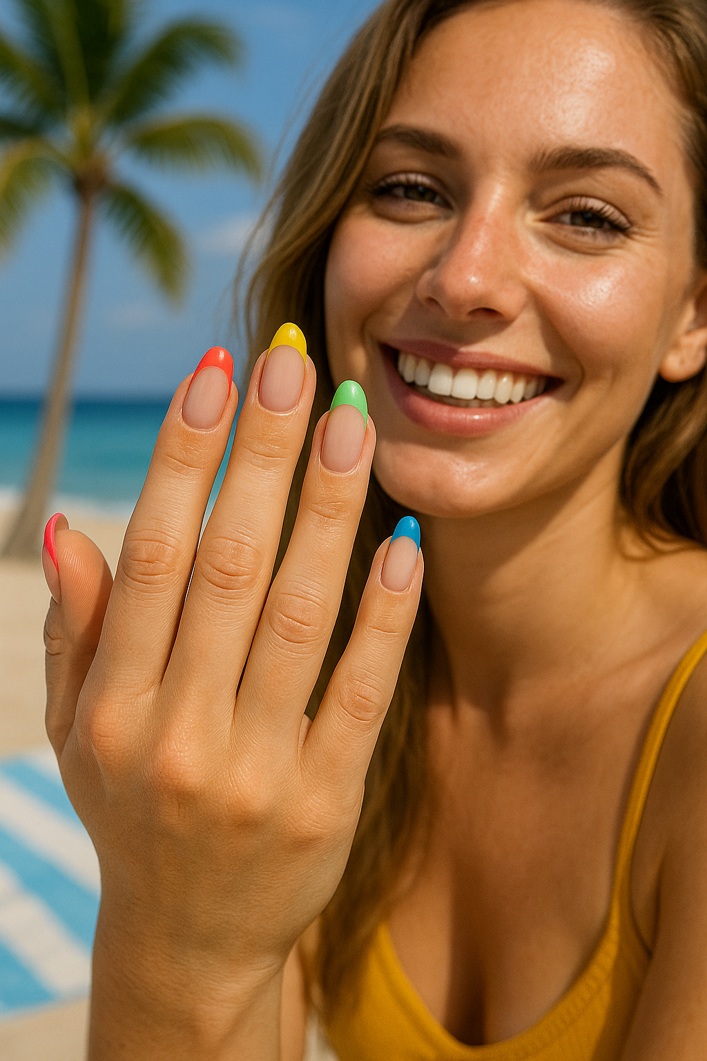 Jasné neonové špičky na nude nebo mléčném podkladu vytvářejí moderní, hravý a letní efekt.